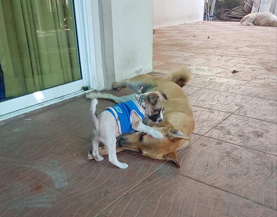 The little puppy was given a checkup at the vet and was found to be in good health. Khemjira named her new furry family member Nom Chom, and she quickly became comfortable in her new forever home. Nom Chom is now showered with love and attention from her new human mom and fur siblings who are taking great care of her.