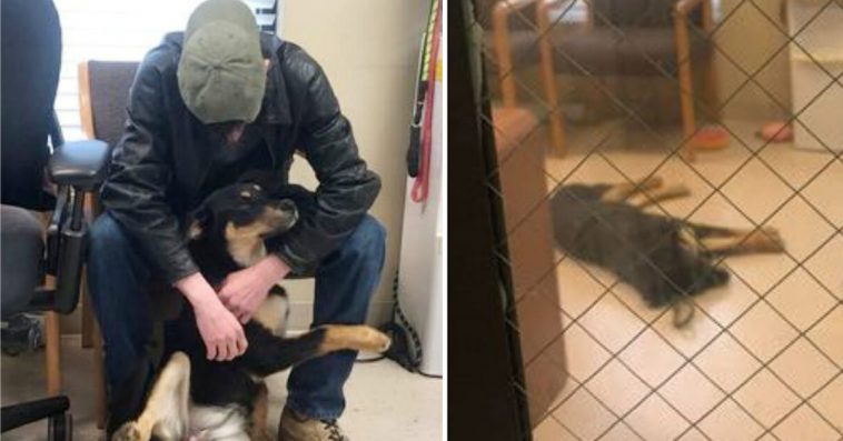 “She kept herself pinned to his legs while he was here,” the shelter wrote. A photo shows the dog laying on the floor, devastated, after her owner left.