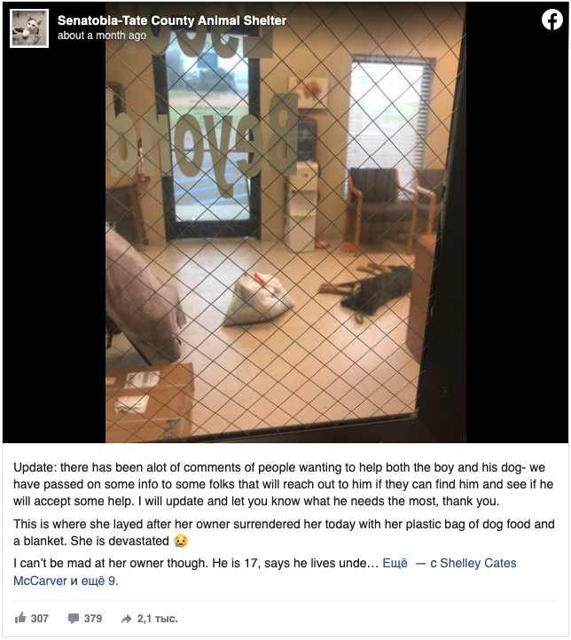 On April 5, the Senatobia-Tate County Animal Shelter, in Mississippi, shared a sad bit of news on social media: a 17-year-old surrendered his dog into their care. According to the post, the teen was homeless, living under a bridge, and could no longer give the dog the care she needs.