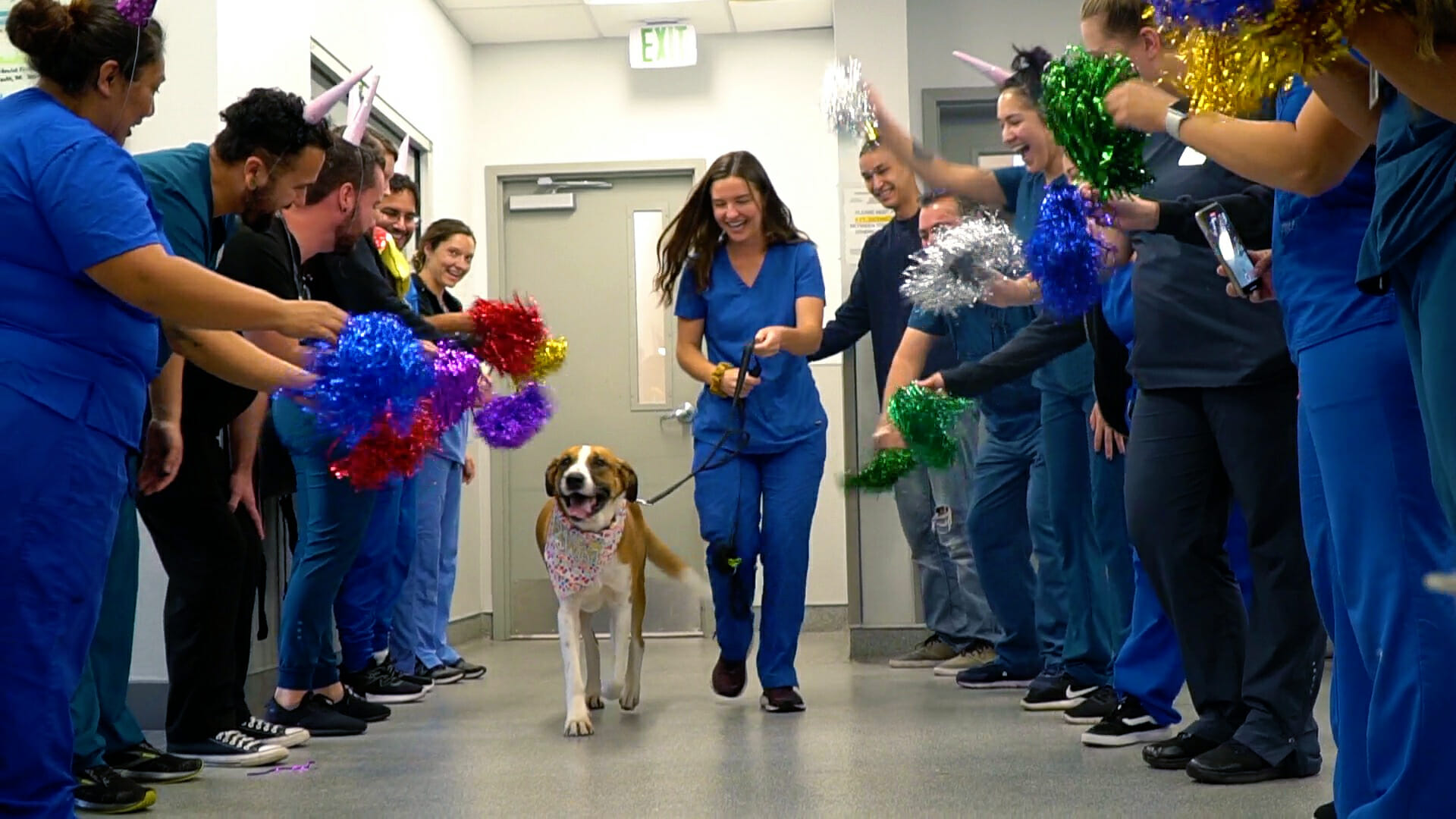 Not only is Phoenix cancer-free, but he’s living his best life in his new home. According to the press release, the dog was adopted by San Diego Humane Society Veterinary Assistant Colette Troughton.