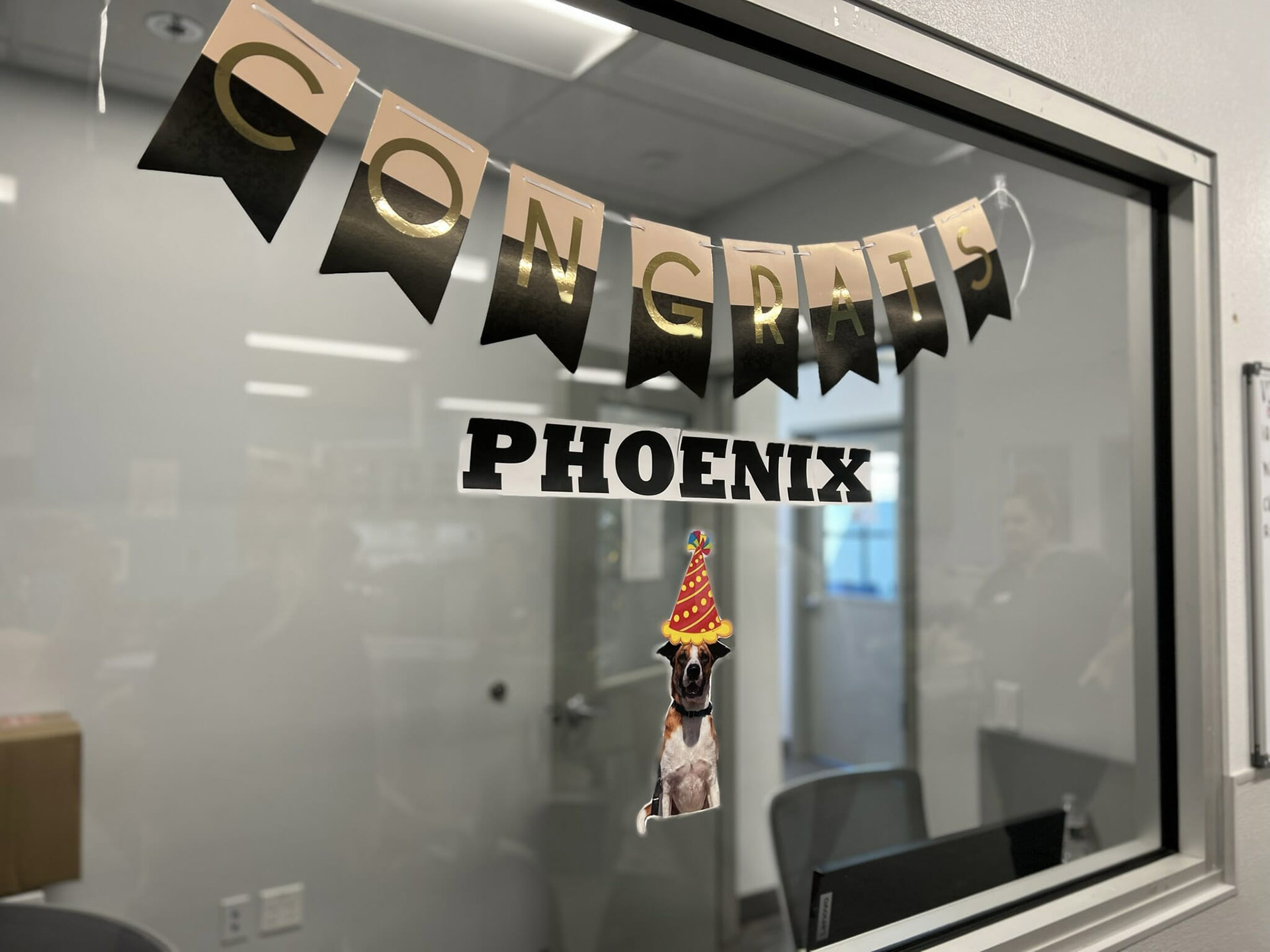Phoenix’s friends lined the hall to cheer for him as he entered the building, donning a bandana that read “Life’s a Pawty.”