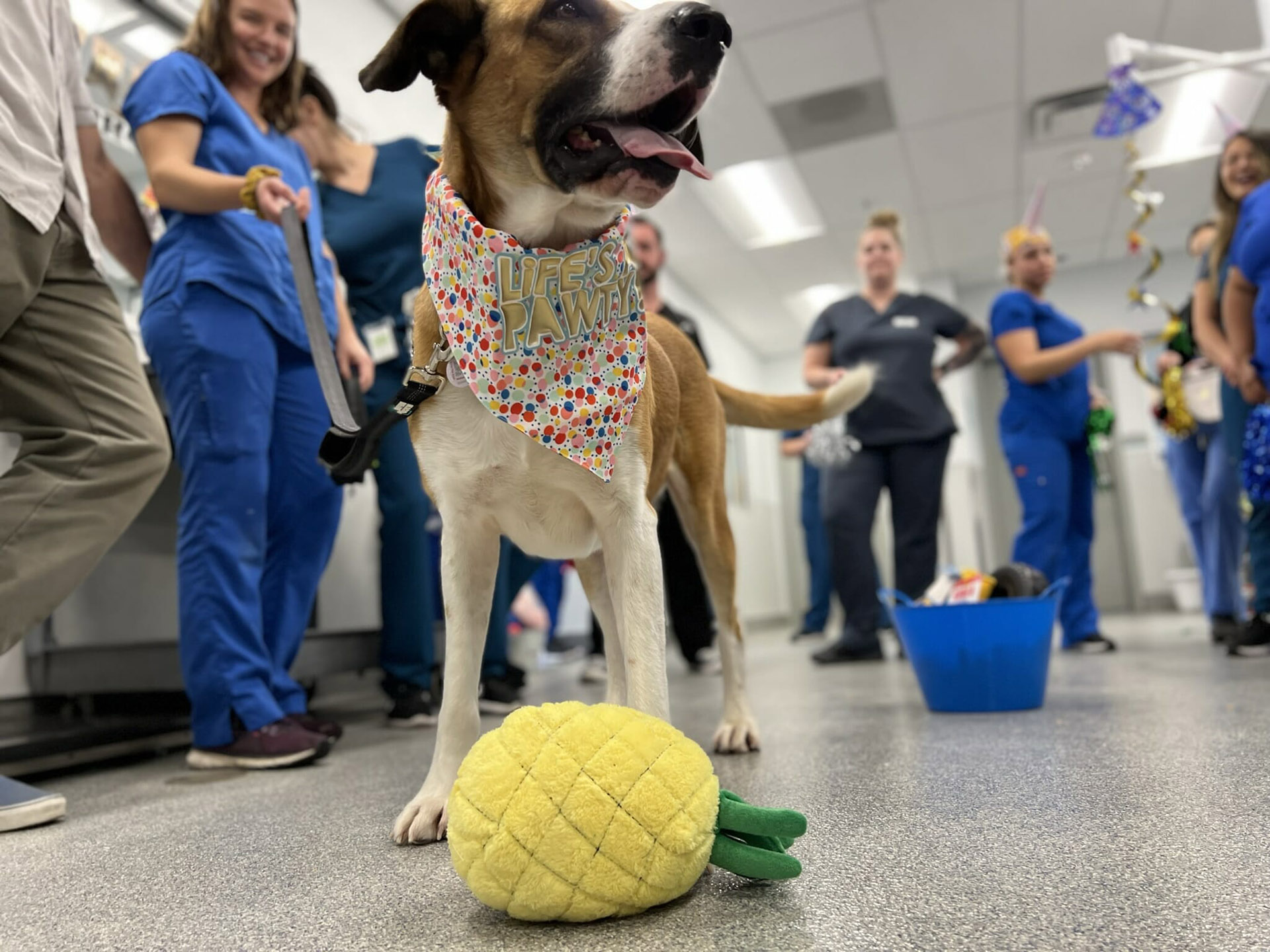 So his old friends at the SDHS medical team knew they had to do something special to celebrate. They threw a lavish “pawty” for their beloved former patient, complete with a peanut butter cake and lots of gifts for the man of the hour.