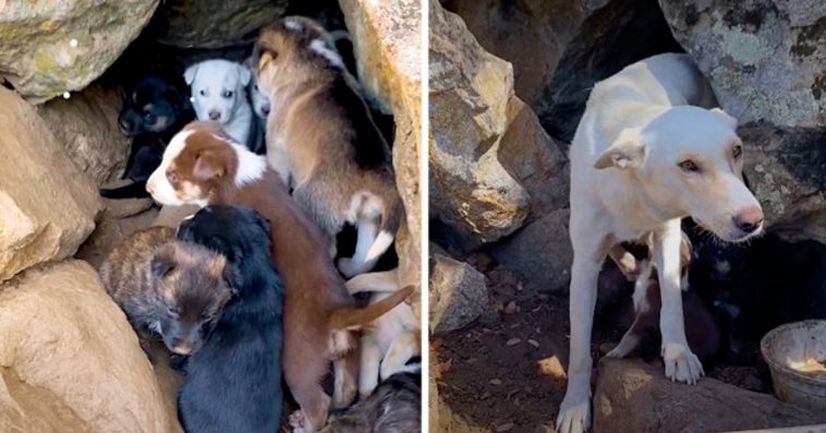 A woman called Eve was led to a cave after hearing cries of ten little pups, and she found them huddled up together. When the woman, who works with Puppies Without Borders, arrived at the cave, she was surprised to find their mama.