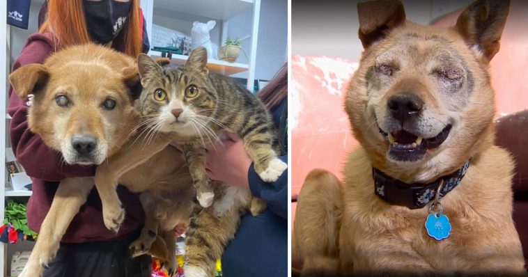 Contrary to the age-old saying “fighting like cats and dogs,” this unique duo, Spike and Max, exemplifies the strength of collaboration, teamwork, and an unbreakable bond. Spike, an 8-year-old mixed breed dog who has lost his eyes, found solace and companionship in Max, his feline counterpart of the same age. The devoted pair was surrendered by their previous family to Saving Grace Animal Society, an animal shelter in Alberta, Canada.
