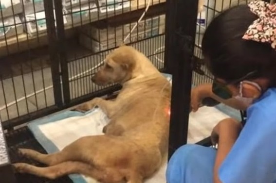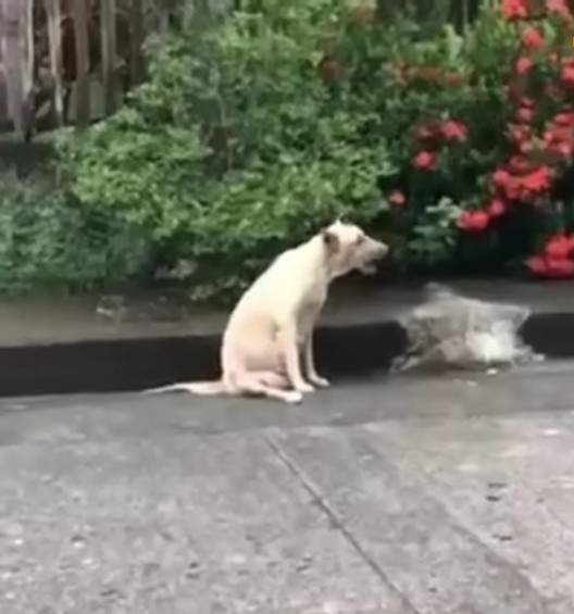 She has clearly just given birth and is probably in distress at not being able to find her puppies. People pass by but no one helps her as she sits immobile alongside the road, weeping in anguish for days.
