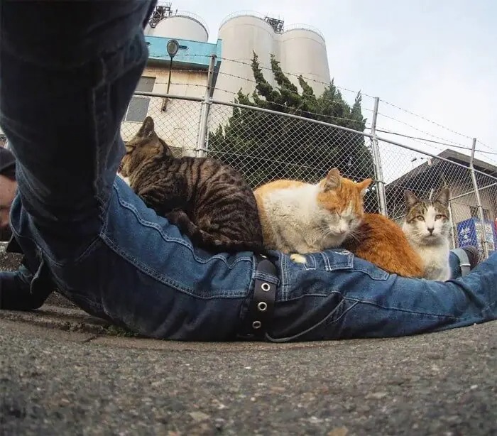 #9 Nyankichi befriended those energetic critters and earned their trust quickly. He just wanted to be a cat daddy at that moment