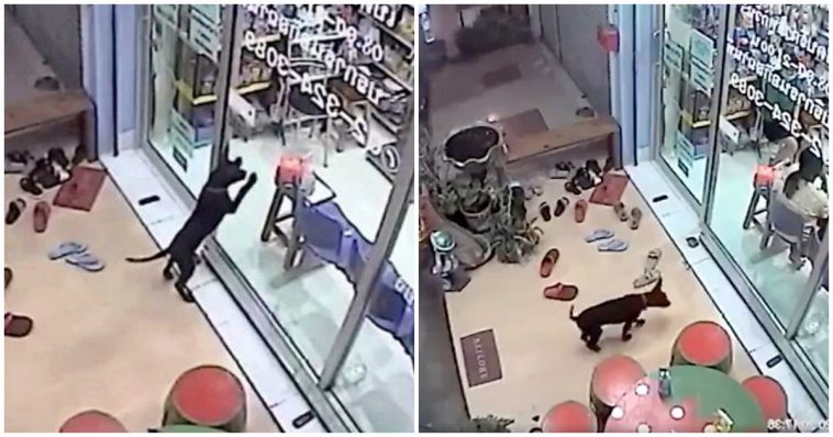 Once they noticed the pup, they opened up the door for him and let him inside.