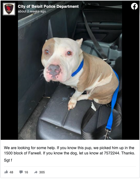 On May 1, the City of Beloit Police Department picked up a stray dog, and shared a photo hoping someone recognized it: