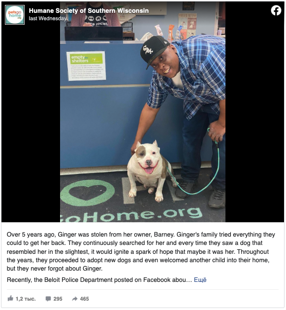 According to a Facebook post from the Humane Society of Southern Wisconsin, a dog named Ginger was stolen from her owner, Barney, five years ago. The family searched everywhere, but it seemed Ginger was gone for good.