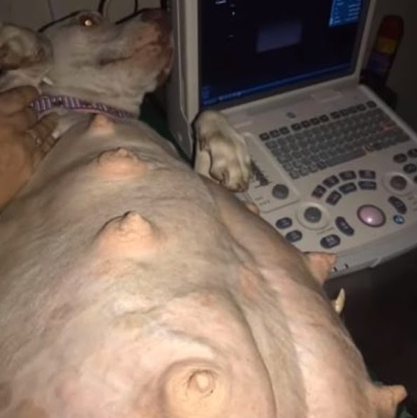 After a thorough examination, she was allowed to rest, and the next day she underwent an ultrasound to assess the well-being of her puppies.