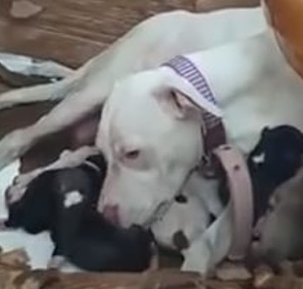 When the moment arrived, the pregnant pit bull gave birth. With unwavering determination, she bravely brought five adorable puppies into the world, one by one.