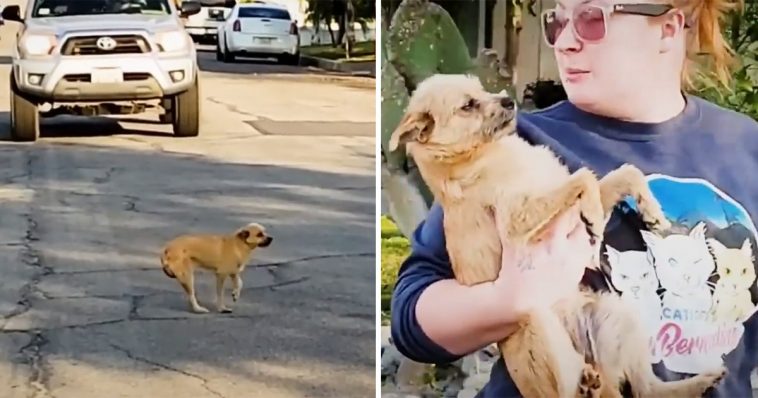 Rescuers from Cats of San Bernardino arrived on scene where a small dog in the middle of the road refused to move, even with a truck coming toward her.