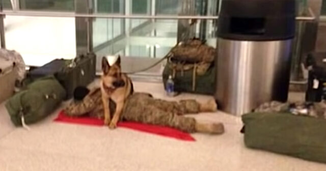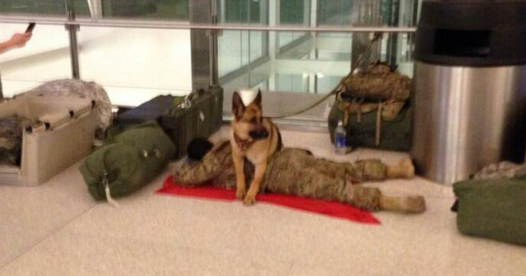 And one particularly exhausted soldier’s battle buddy took it upon himself to guard and protect her during her sleep by lying directly on top and keeping a lookout.