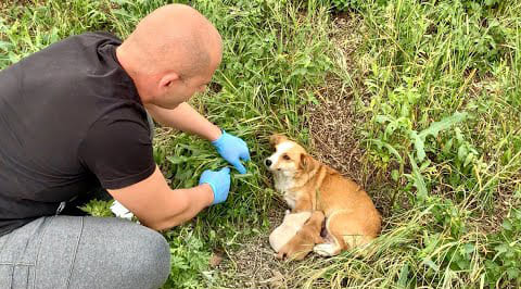 When rescuers came, she was hiding in the grass by the road with her kids, attempting to protect them while waiting for her owners to come for her.
