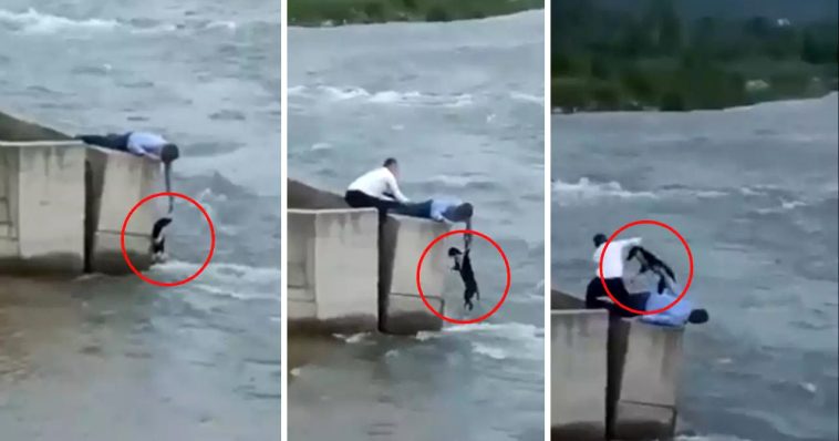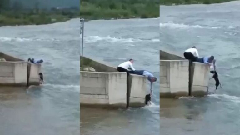 In the three-minute-long video, a dog can be seen looking up at the concrete base near the overflowing stream. Within moments, a man decked up in a formal two-piece suit approaches the riverside to start his rescue attempt. The man removes his two-piece coat and tries to reach the struggling canine as the water continues to flow rapidly beneath the dog.