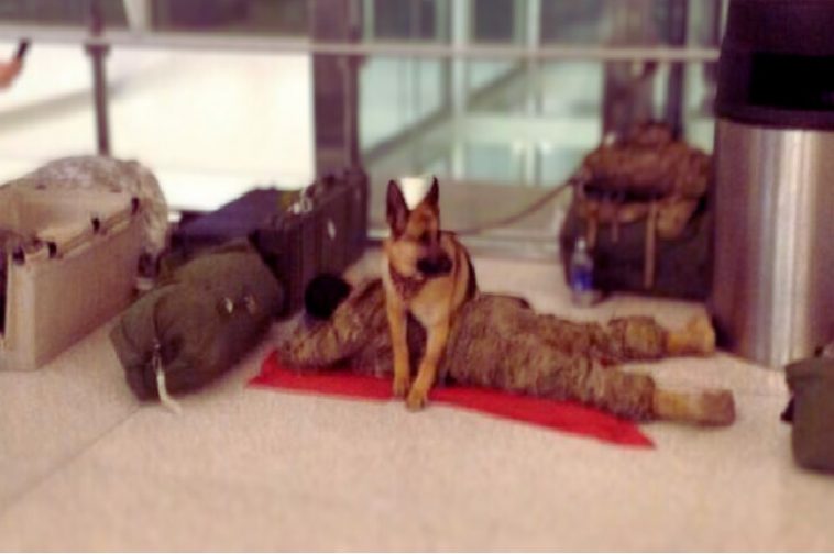 This dog is part of a squad of ten soldiers and two dogs that is resting at the airport. They appear exh.austed and close their eyes for a few moments wherever they can. The amount of luggage indicates that they have traveled a long distance, though it is unknown whether they are currently on a mission or returning home.