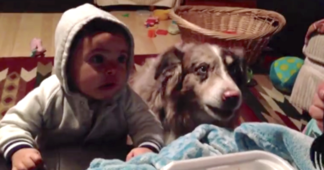In the video here, Mom is trying to get the baby to say “Mama.” But the Australian Shepherd is smarter than people think! He’s seen this trick done once or twice, and he knows if you answer correctly, you get a treat.