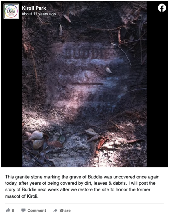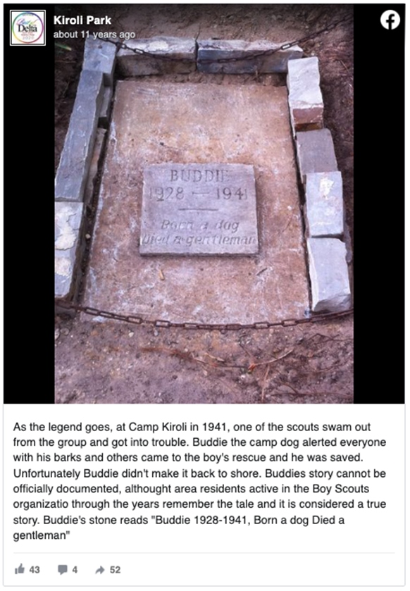 According to a post from the Kiroli Park Facebook page, legend says that when the area was a Boy Scout camp called Camp Kiroli, a scout went swimming on the lake and started drowning. Buddie saved the day by barking for help, leading to the boy being saved, but sadly Buddie himself drowned.