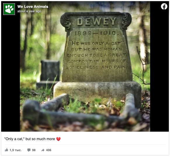 It’s reminiscent of the gravesite of Dewey, a cat who was described as “human enough to be a great comfort in hours of loneliness and pain,” despite being “only a cat.”