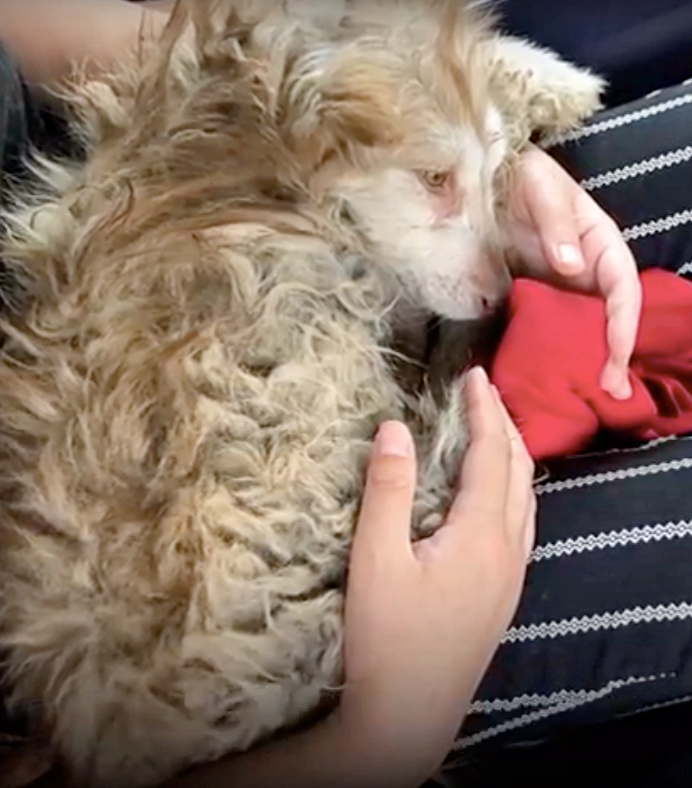 They decided to take this dog in and name her Harriet. As soon as they got in the car, she plopped in a volunteer’s lap and finally felt safe for the first time.