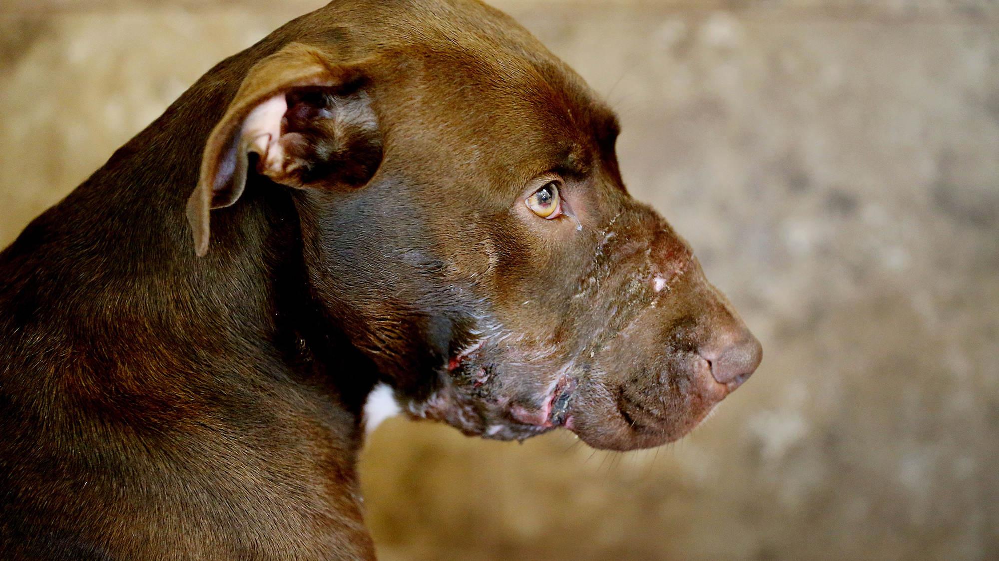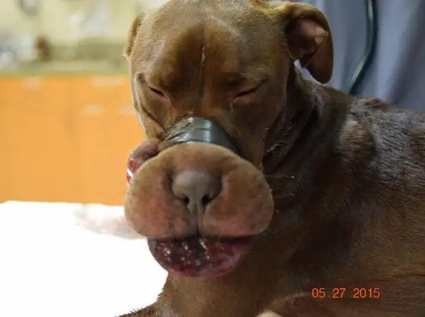 Caitlyn’s muzzle shows signs of being tied for a long time, leading to blood vessel blockage.