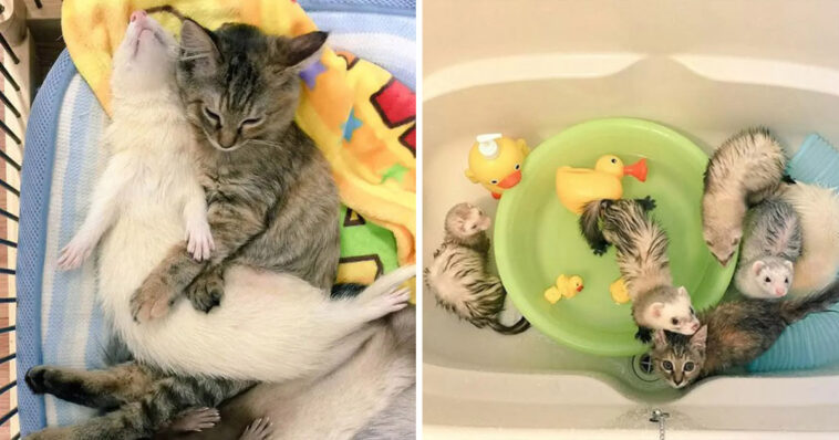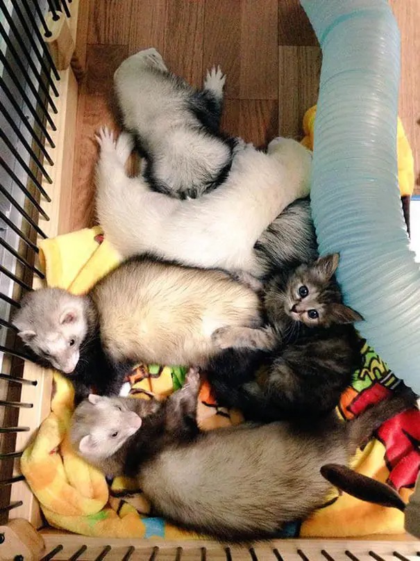 This poor pint-sized stray kitten (now named Komari) was found when she was just 5 weeks old. There was a family, who already had 5 little kiddo ferrets, brought her home and nursed her back to health. Soon after that they let Komari bond with her brothers, and they did a good job! Komari was convinced herself that she was a ferret too!