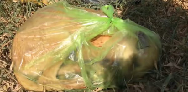 When they arrived at the scene, they discovered the bad dog tied in a trash bag on the side of the road, laying lifelessly among rubbish.