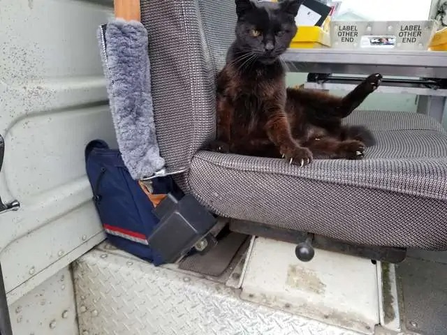 “On my runs, there are a few dogs that I enjoy seeing, and a couple who seem to recognize the sound of my truck’s door sliding open. McEuen told The Dodo, “If I can make it work, I prefer to at least offer them a ‘hello’ and some brief love before going on.” “However, Bijou is the only cat on my routes that appears to make it a point to pay me a visit every time I pass by.”