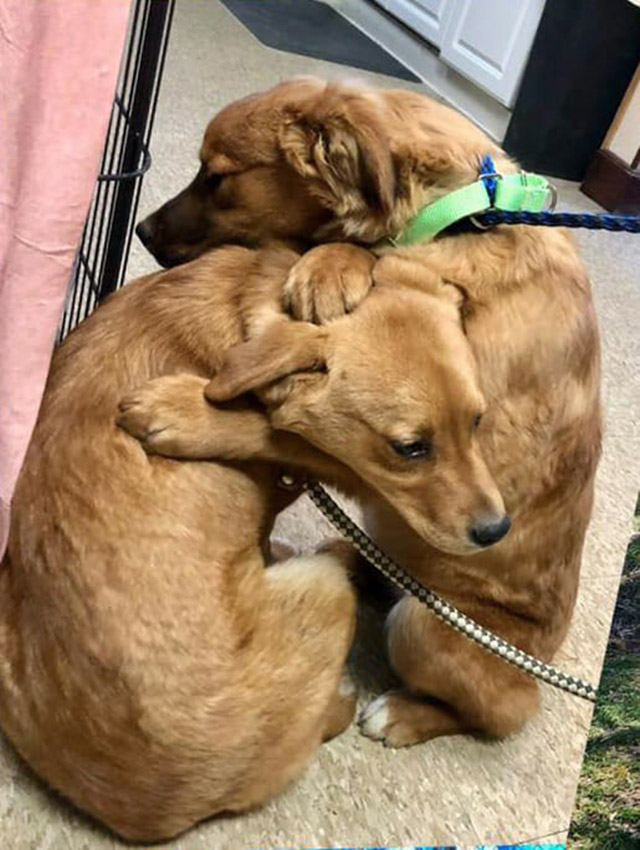 What a sweet photo — we’re so glad these dogs are doing well now after being rescued, and have each other for love and comfort through it all.