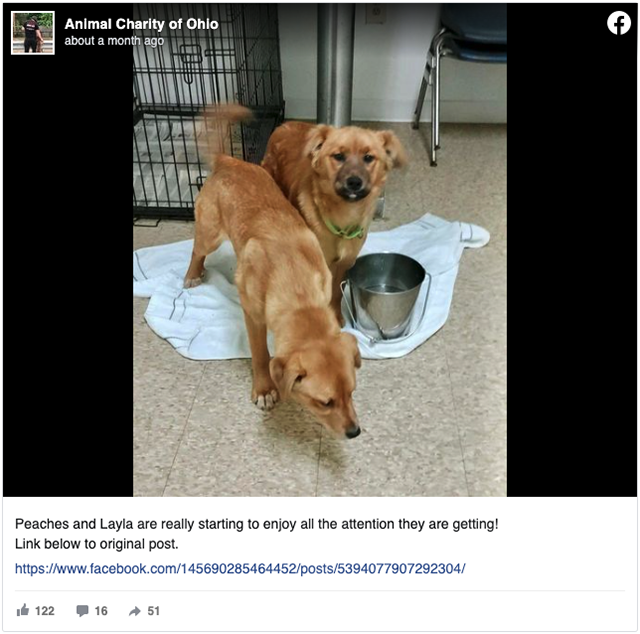 While they arrived scared and skittish, Peaches and Layla are now settling in well. “Peaches and Layla are really starting to enjoy all the attention they are getting!” Animal Charity of Ohio wrote in an update on Facebook, sharing a photo of two happier-looking pups: