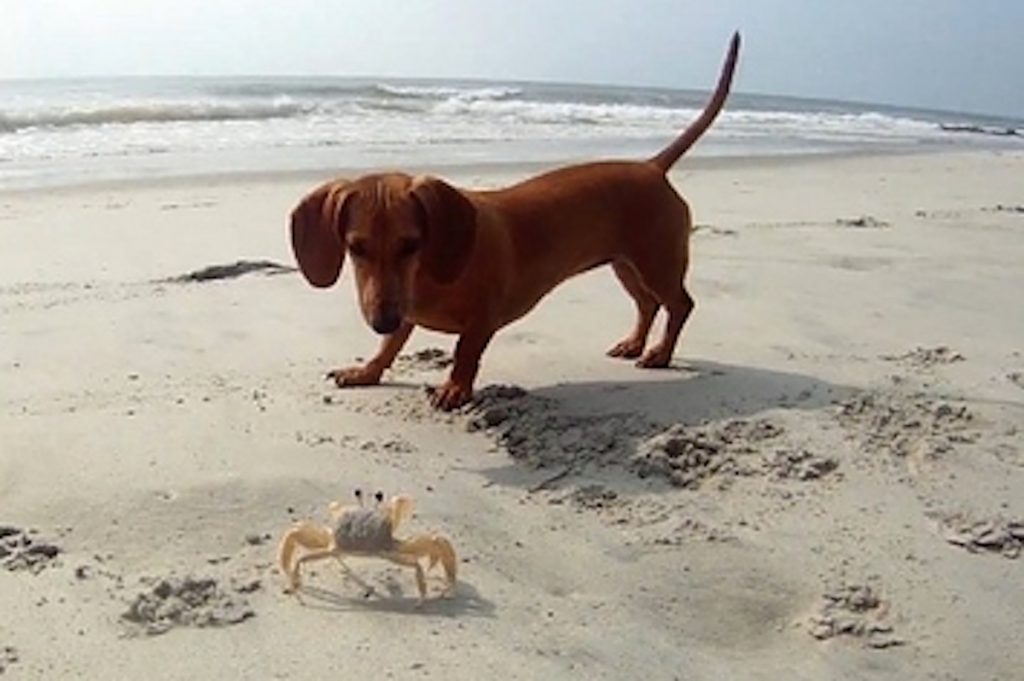 The dog was just sniffing around the beach when she encountered a ghost crab! The two dance around each other and interact in a way that reflects their curiosity of one another.