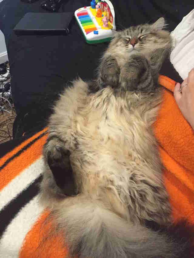 “I started waking up with him sleeping on my legs,” Kitchen said. “The next night he would curl between my legs, which is a huge deal because he would never come that close. Finally he is sleeping on my stomach now. If I’m sleeping on my stomach then he tries to balance himself on my back.”