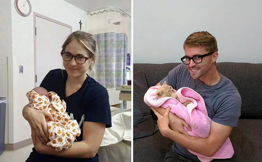Babble contacted with Yates and asked him about the same differences between a cat and a baby. “They both like to eat off of and crawl on the floor, they both like to bite me, they’re both really small, they’re both really hard to control, and I can’t give birth to either of them!”