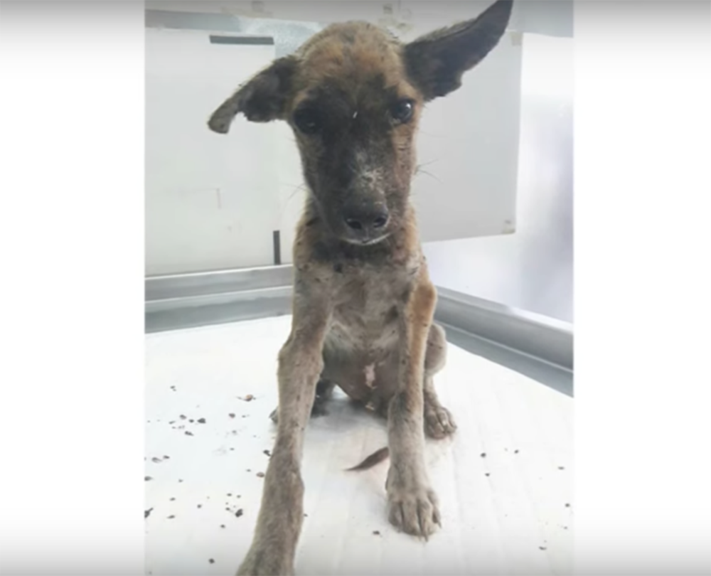 Because he is so frail, he looks hunched over. His body is a sad reminder of what too many homeless animals go through. The puppy’s rescuers carry him gently into their vehicle and bring him in for emergency medical care.