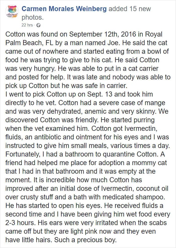 “Cats like Cotton depend on people to heal because they cannot always ask for help … I’m sure so many people passed him by because of how sick he looked, but he was just waiting for someone to give him a chance.”