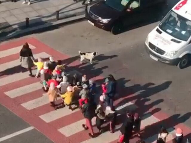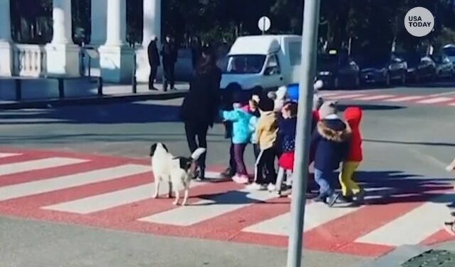 Then, in the spirit of safety, he stands in the middle of the street with the kids and helps them get to the other side. The adorable children all hold hands, their teachers are nearby, and Sausage makes sure they are out of harm’s way.