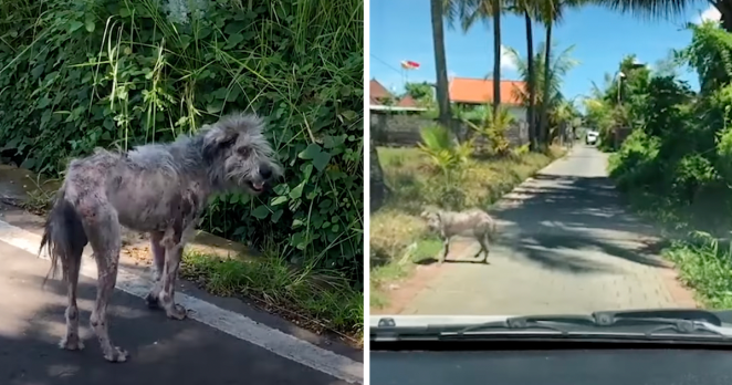 Prue and Julie of Mission Pawsible saw this werewolf hybrid-looking stray dog on the road in Bali and stopped to help.