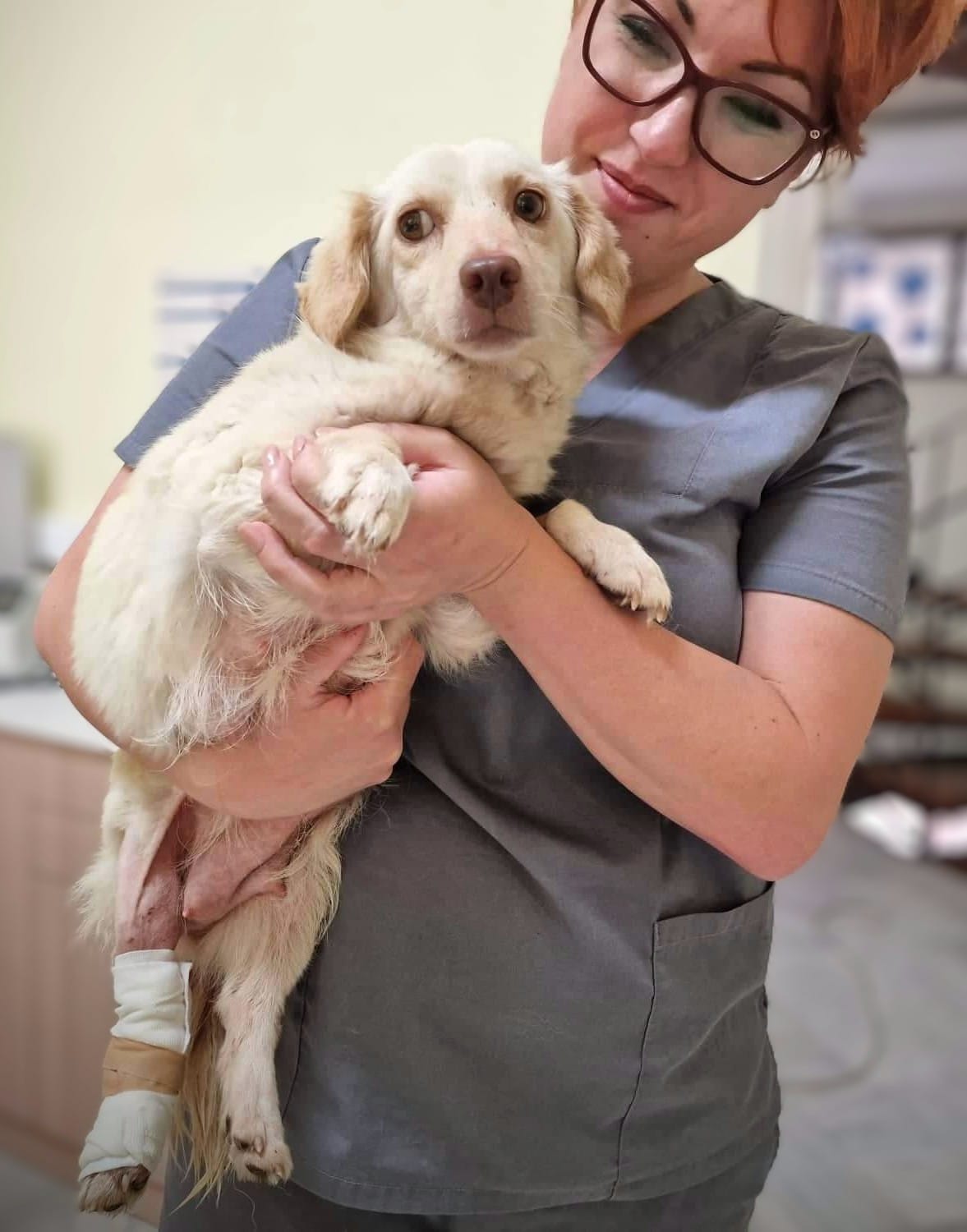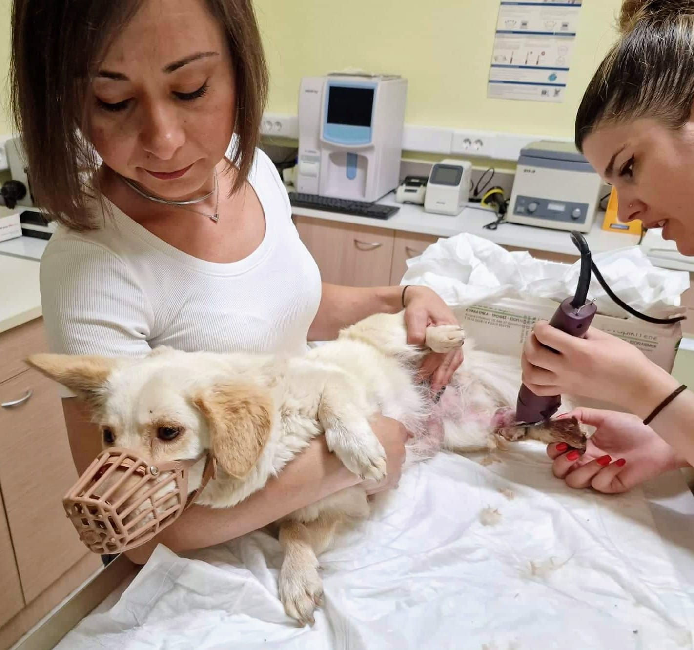 Early the next morning, vet Rania carefully examined Souzi to evaluate the extent of her injuries. As expected, her leg is in a severe condition, with fractures in two places and damaged skin. Consequently, Souzi and her puppies will remain under Rania’s care for a while.