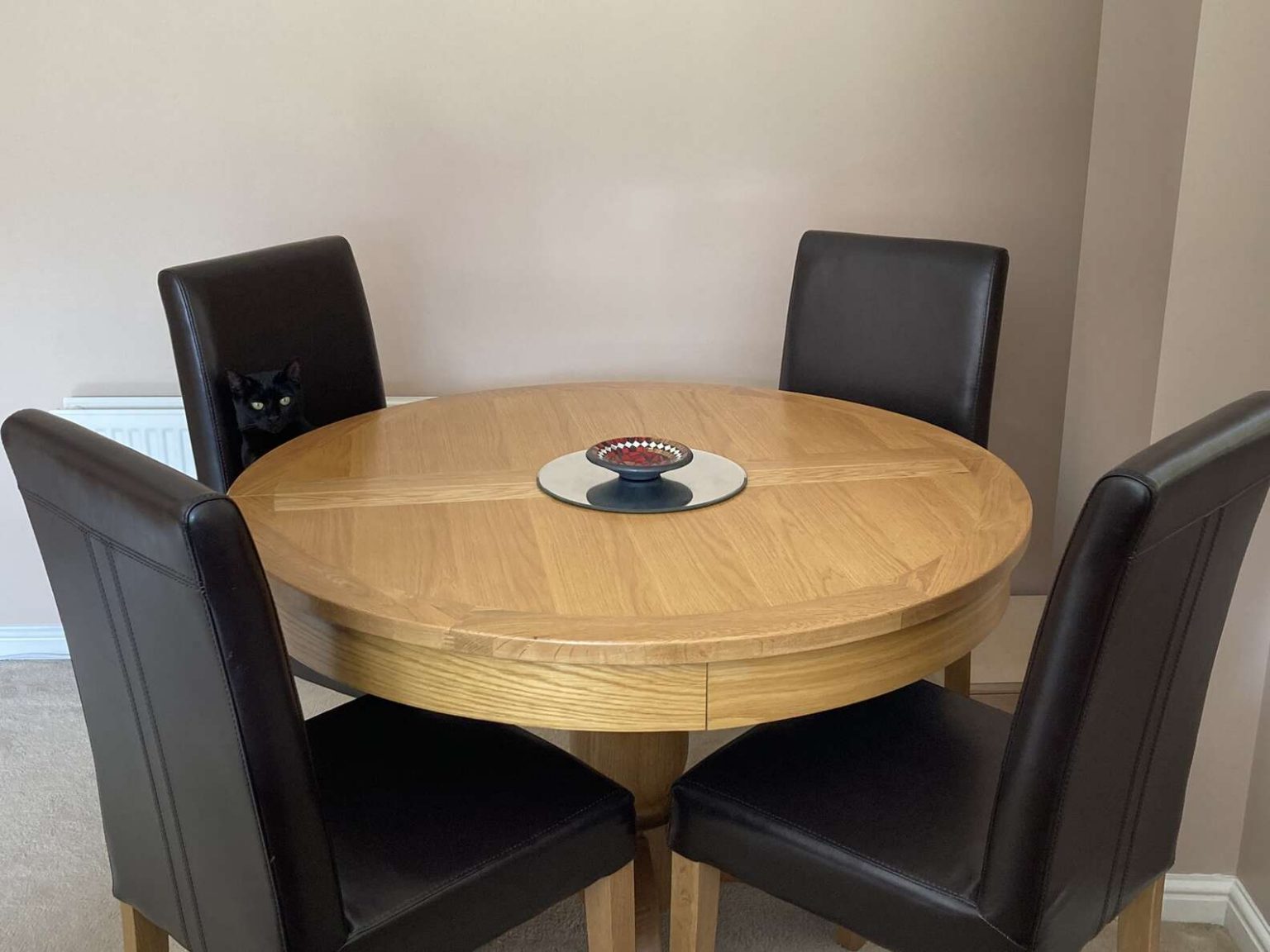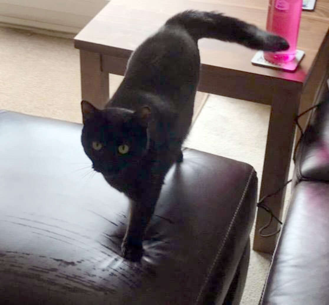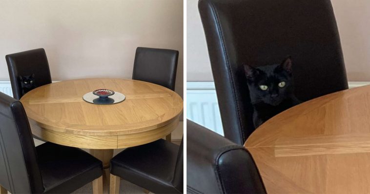 A black cat had entered Trenery’s open patio door and found a new home on one of her black dining chairs.