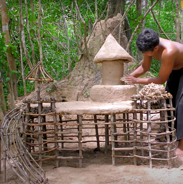 First, he collected dozens of branches from nearby woods. In the video below, you’ll see him sharpening the end of each stick and hammer them into the ground in order to create a foundation for the castle.