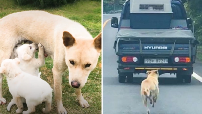 With the puppies safely loaded into his truck, the man embarked on a ten-minute journey to Karlee’s home. To everyone’s surprise, the mother dog faithfully trailed alongside them throughout the entire journey. Despite having to make frequent stops to provide her with water breaks, they persevered.