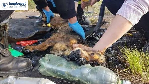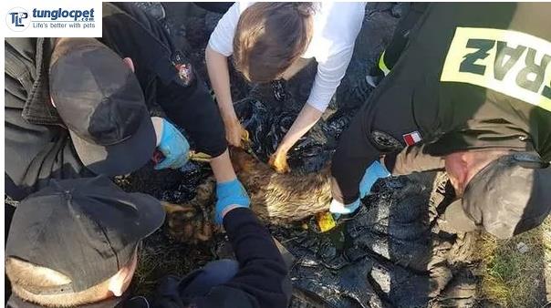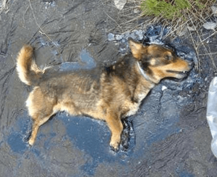 The dog was discovered when half of its body was buried under the asphalt, now it can only bark weakly to ask for help from people around. The dog’s pitiful cry saved its life when it was discovered by workers near the town of Suwałki, Poland.