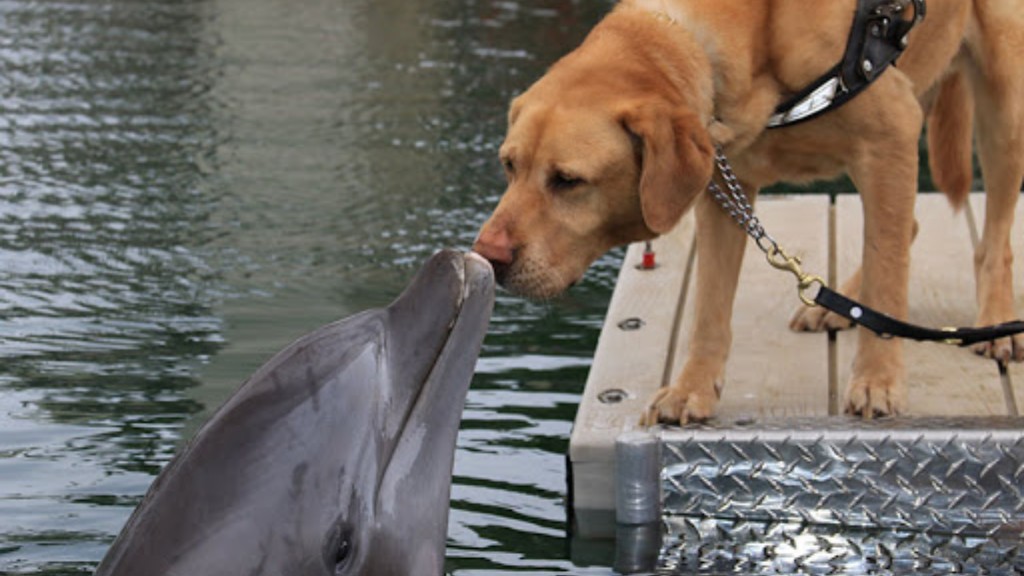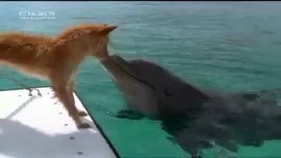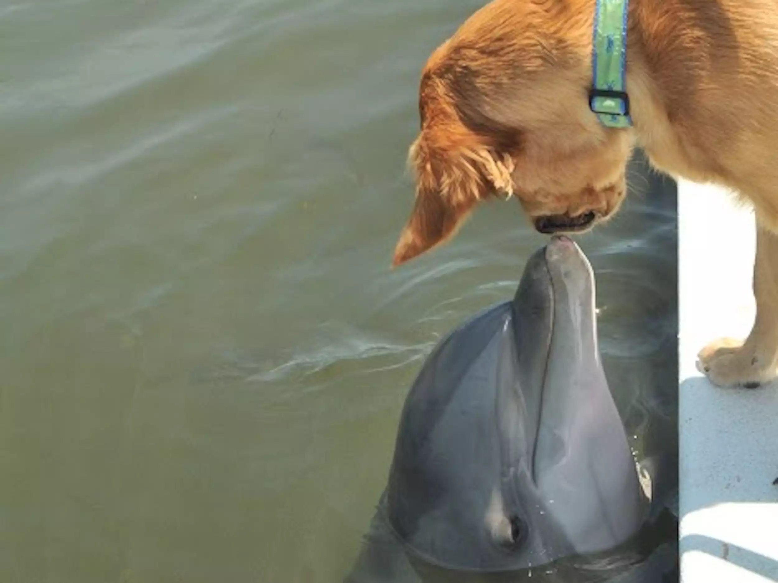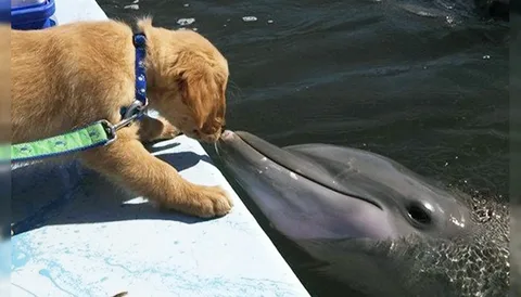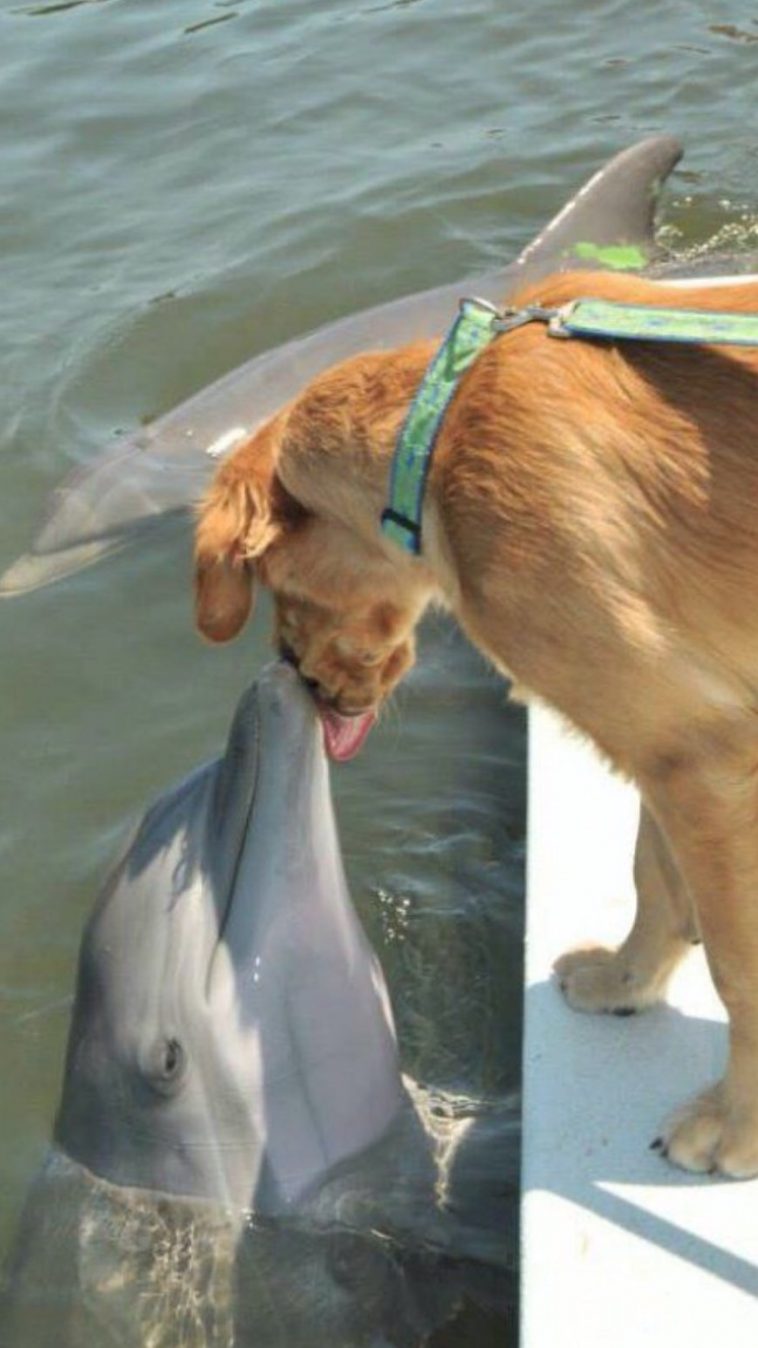 Dolphin waiting for a cute dog kiss from his Golden friend and their photo went viral on social media