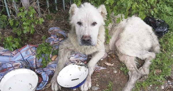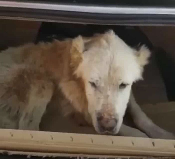 A stray dog suffered for three weeks before some kind strangers discovered he was there.This poor senior dog suffered in the heat for three weeks when his rescuers finally found him. He had no protection from the sun, except for a few weeds and some chain-length fence. It was a miracle he was alive.