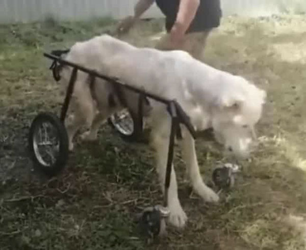 He still had great trouble, so they had him in a wheelchair and the dog proved he wanted to try. He worked to move his wheelchair and soon began to crawl. Deep down inside he still had a will to survive after all he’d been through.