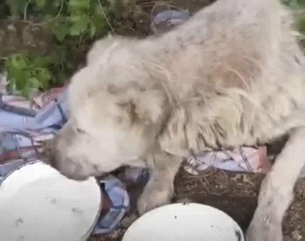 The poor dog was thirsty and hungry and could not even stand up to eat. He was brought water and food, which he devoured. He cried as he ate but it seemed to be more than hunger and thirst preventing him from getting up.