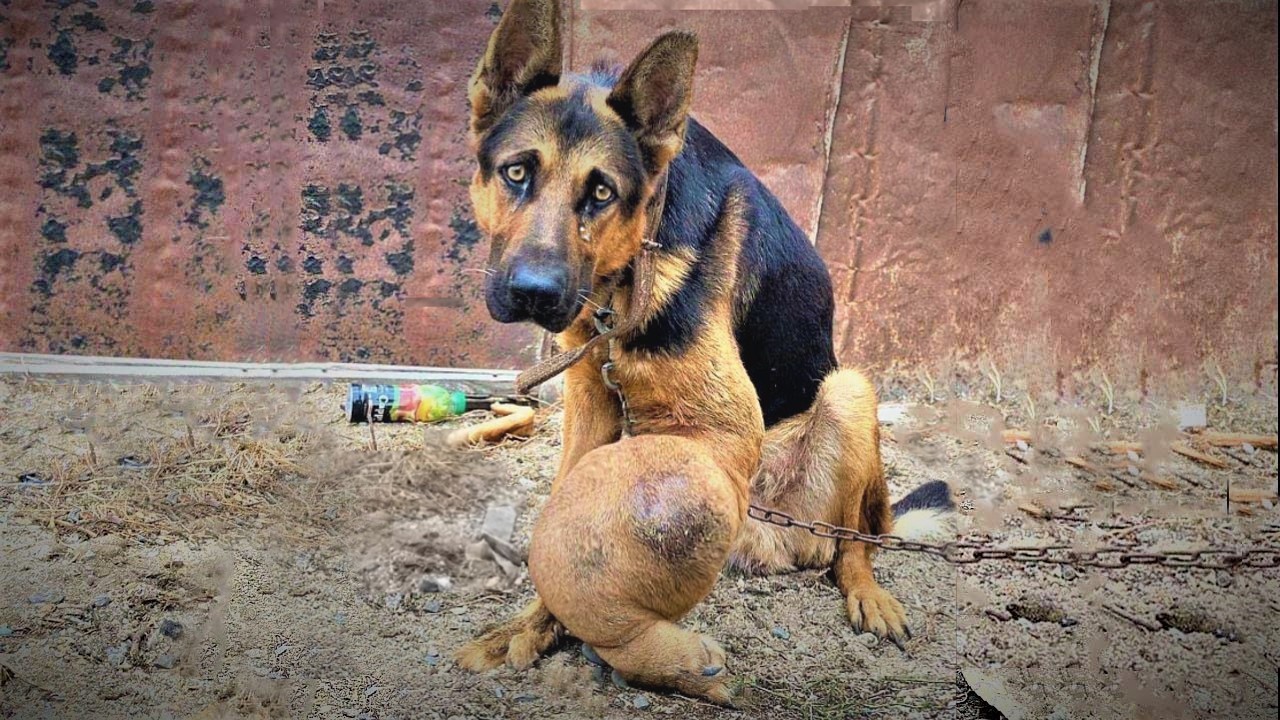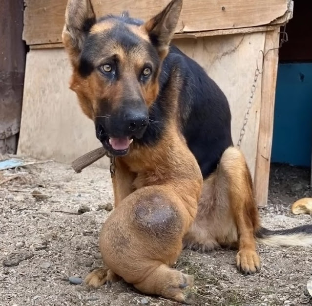 The dog appears to be suffering from bone cancer, but has never been treated, and has lived on a short chain for many years, fed on waste and rubbish, and as a result of a lack of nourishment and vitamins, it has acquired osteosarcoma – a kind of bone cancer…