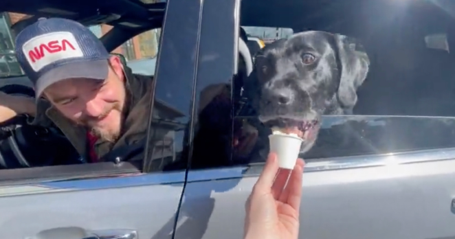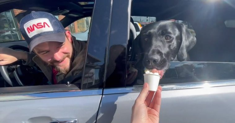 “Dakota (our black lab) loves going through our local coffee shop line to get his weekly ‘pup cup’ treat. He was a little too excited and ended up sucking the whole cup in!” they said. Too funny!