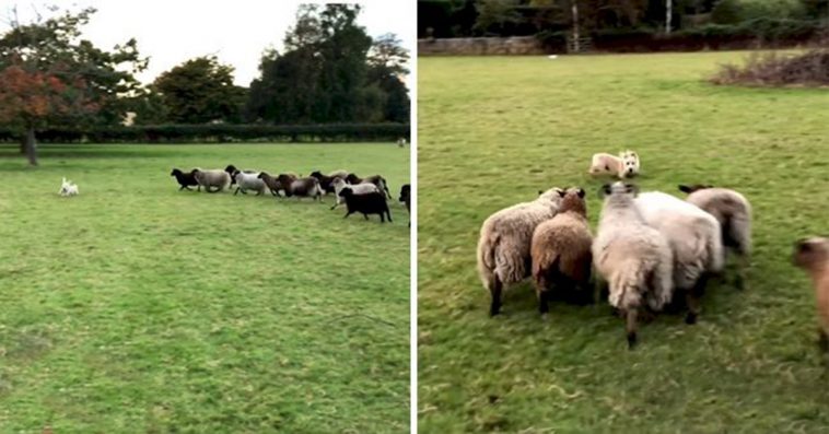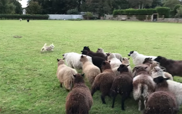 The “World’s Worst Sheepdog” playfully runs up to the herd before circling around them. This is when the sheep start chasing after the dog!
