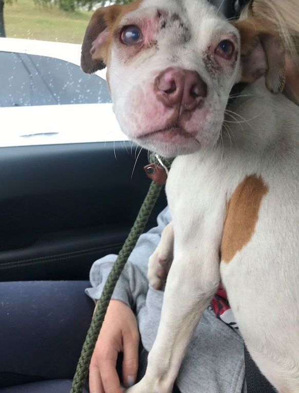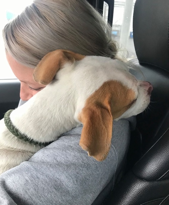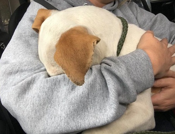 As soon as they placed Chowder in the car, he buried his head in one of their shoulders, seeking comfort.
